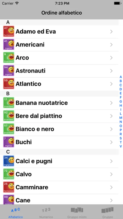 Facile da trovare-quattro raggruppamenti: ordine alfabetico, ordine numerico, gruppo misto, gruppo in ordine alfabetico.