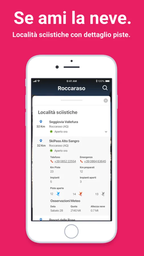 Fornisce inoltre dettagli sulle località sciistiche ed i relativi impianti (Numero piste, tipologia, piste aperte), informazioni dettagliate per le località marine (analisi acque, divieti di balneazione) e le osservazioni in tempo reale dai principali aeroporti italiani.