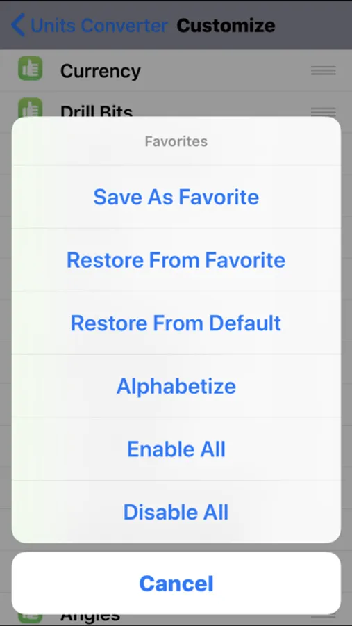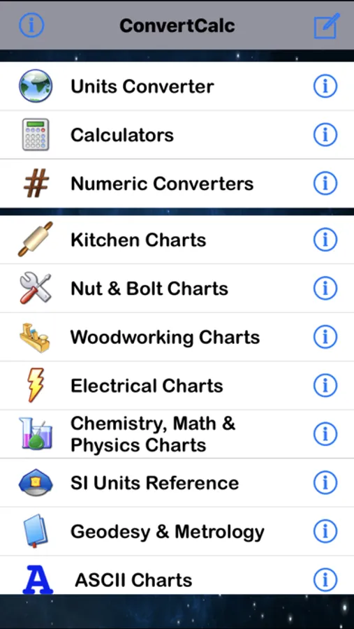 You can easily disable units & charts you don't need and put them in whatever order best suits you, then save it as a favorite and quickly switch between your favorites and the app defaults. There is also a powerful search feature to simplify locating a unit of interest, regardless of category.