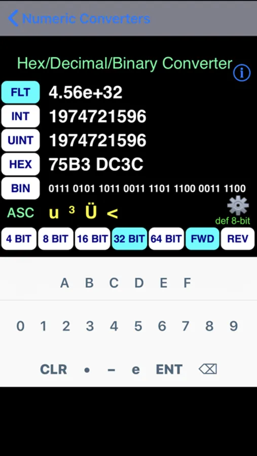It also includes a Hex-Decimal-Binary Converter with IEEE754 floating point notation capability and a Roman Numeral Converter. It also includes a Simple, Scientific and Amortization Calculator. The Scientific Calculator utilizes 64-bit base-10 decimal math providing 38 digit results.