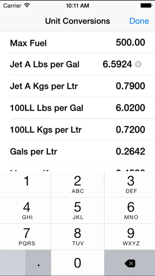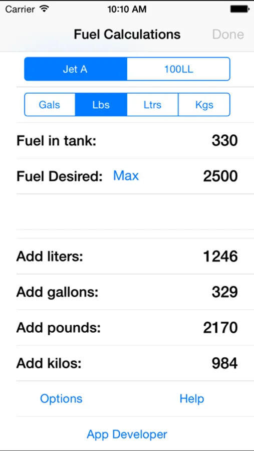 This app is written by a pilot to allow pilots and refuelers/servicer to quickly and accurately convert Jet A or 100LL fuel from US gallons (gals), pounds (lbs), liters (ltrs), or kilograms (kgs) and display the amount of fuel to add in US gallons, pounds, liters, and kilograms. All that is required is to enter the type of fuel in the tank, the units, the amount remaining, and the amount desired - the converter will do the work. Easily adjust and save the specific gravity, conversion factors, and the decimal places. I you want to try before you buy check out the free version - Aviation Fuel Converter Lite. It does everything the paid version does except you can't adjust the specific gravity or conversions.