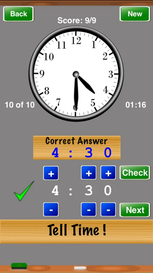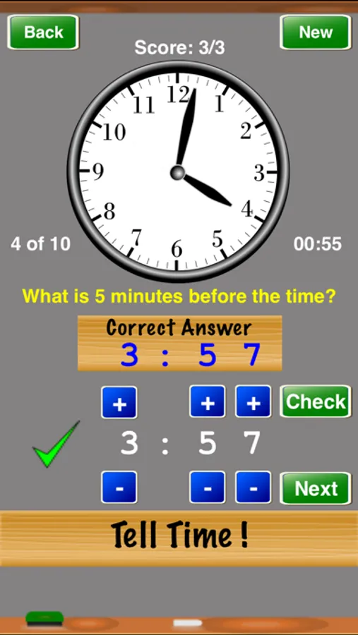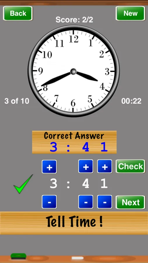 Tell Time ! ! is a great way to practice telling time. Select the difficulty level and number of problems in the "Settings" screen. Progress through the difficulty levels until you master telling time.