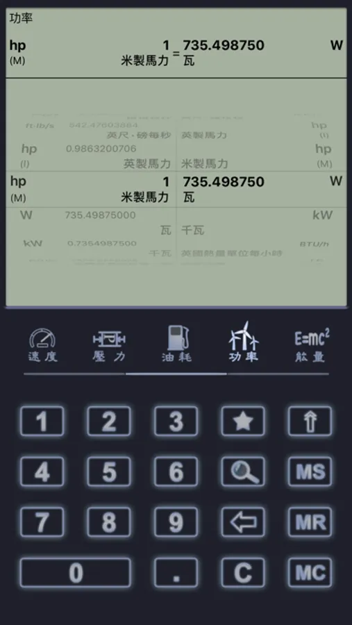‣ 功率单位换算: 可实现瓦, 千瓦, 公制马力, 英制马力, 英国热量单位每小时, 英尺·磅每秒, 美制冷吨, 公制冷吨, 卡路里每秒, 千卡每小时及尔格每秒之间的换算。
