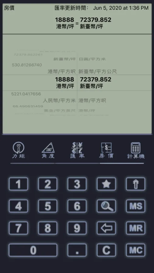 ‣ 房价换算: 房价换算结合当前汇率, 方便您在不同国家及地区的常用房地产计价单位之间快速转换, 现在支持的单位有: 人民币/平方米, 港币/坪, 港币/平方呎, 新台币/坪, 新台币/平方公尺, 美元/平方英尺, 加元/平方英尺, 澳元/平方米, 欧元/平方米, 英镑/平方英尺, 日元/平方米。