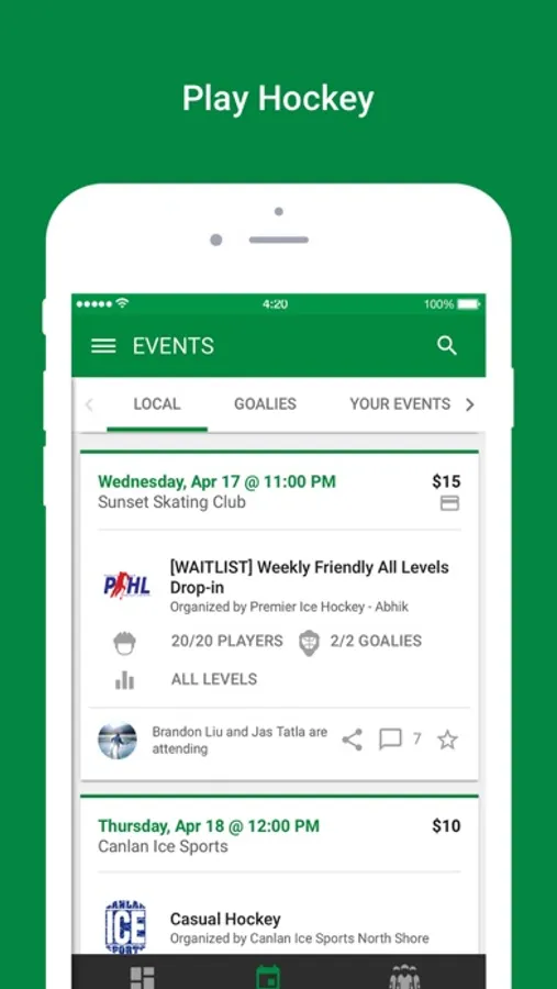 • Join local hockey games, pay online, then just show up to play