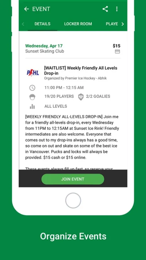 Quickly and easily organize hockey games. Have an ice time you need to fill? Set up your game within seconds and let us track the players and payments for you.