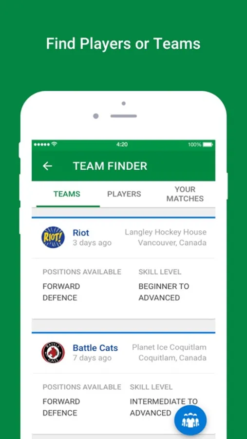 Need players for your team? Use Team Finder to recruit new players. Free agent? You can create a post to find a team. You can also find a goalie for your game!