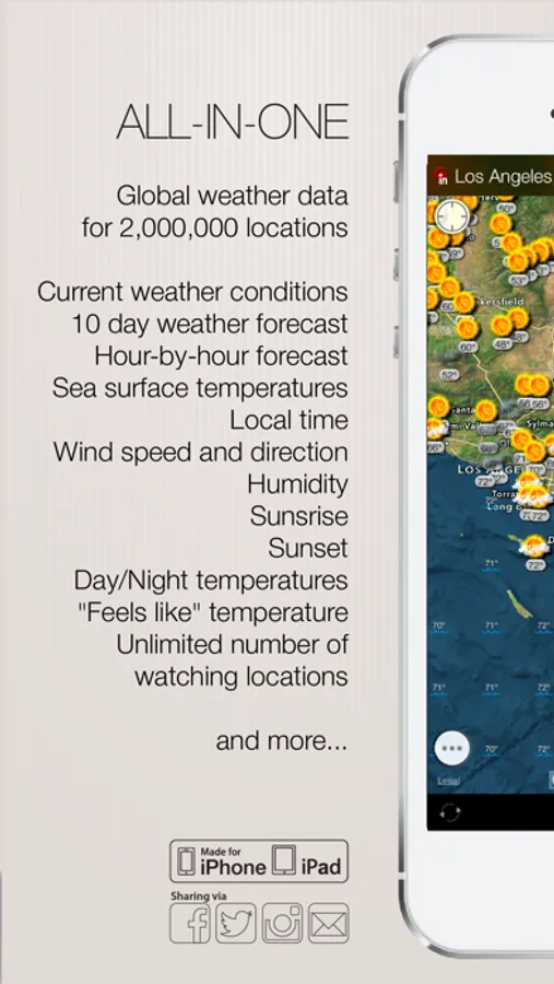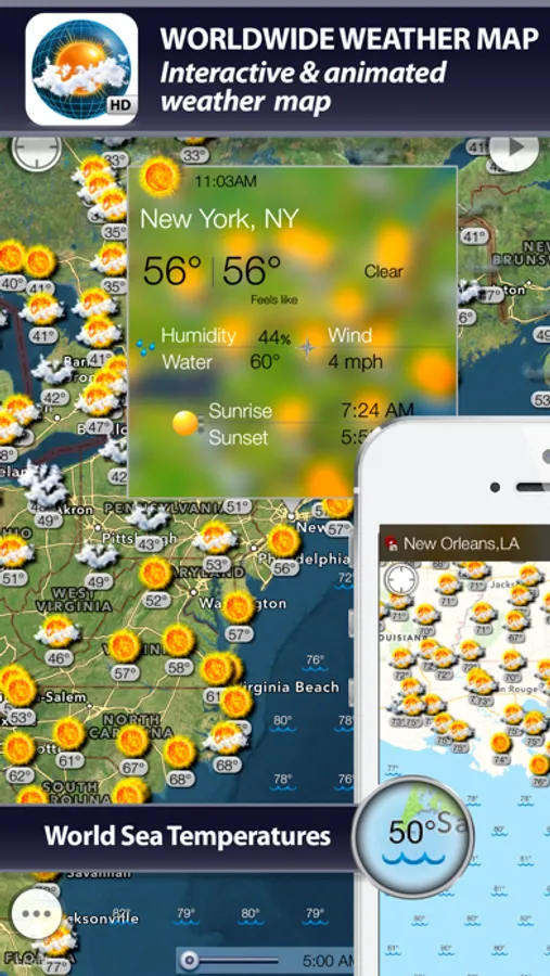Planning a day at the beach or a boating trip? Are you curious about what the water temperature is at your favorite place to swim? World Weather Map HD is the fastest, easiest-to-use, weather application that displays current weather conditions and sea surface temperature directly on the map.