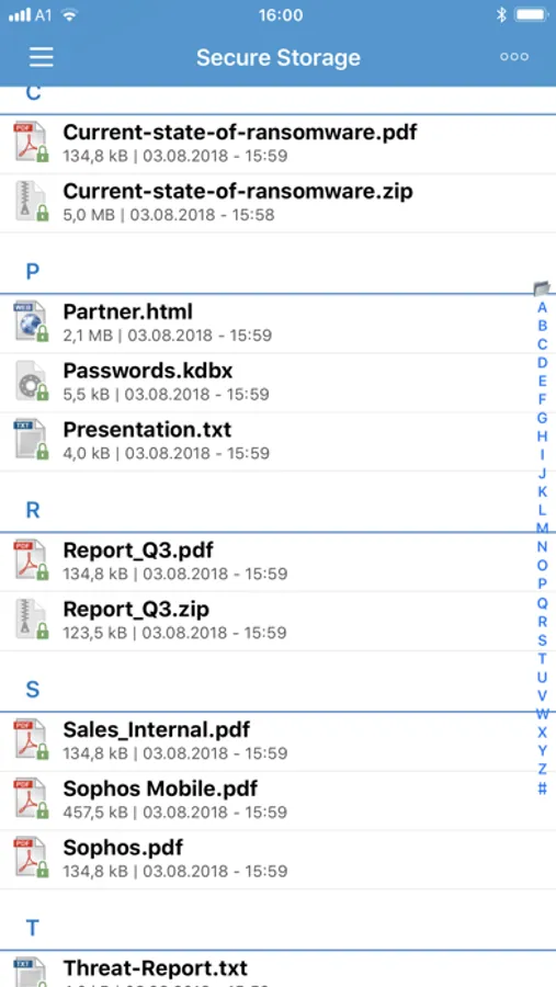 Sophos Secure Workspace is the place where you can access your organization’s documents or websites. All data is stored with AES-256 encryption, matching military grade requirements. Sophos Secure Workspace is designed to prevent data loss if your device gets stolen or lost.