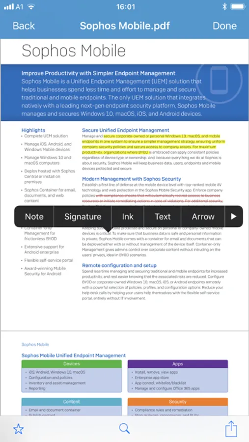 • Publish corporate documents on an Egnyte or WebDAV server or distribute them through Sophos Mobile.
