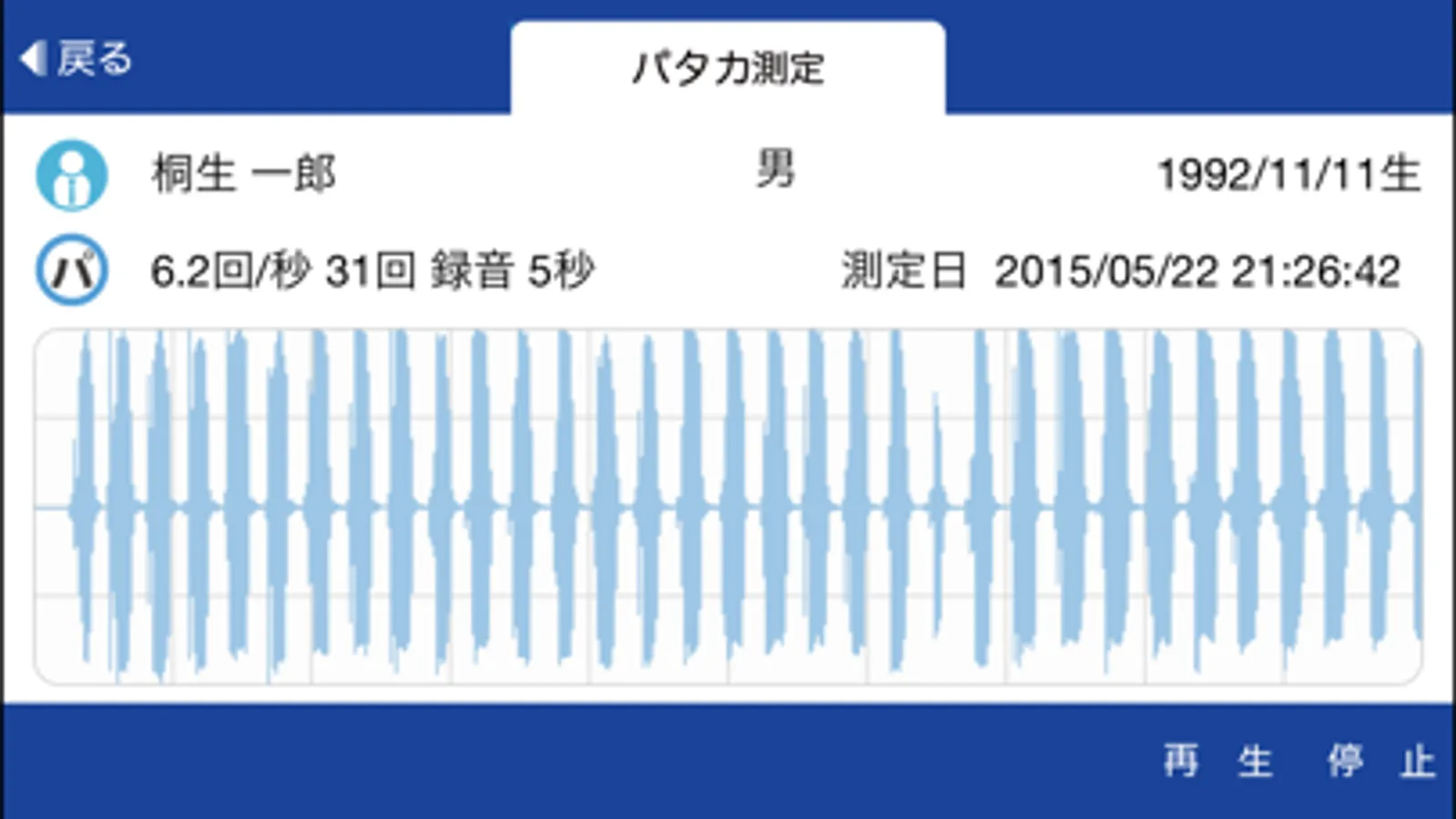 それぞれの音を一定の時間内にできるだけ速く発音し、発音の回数とリズムをはかると、お口の機能を客観的に評価することができます。この方法を 「オーラルディアドコキネシス」 といいます。従来は紙とペンを使ってはかっていたので、たいへん手間がかかりましたが、このアプリを使うと、簡単に正確にお口の機能をはかることができます。