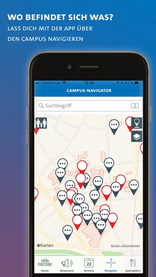 Du weißt nicht, wo sich eine Einrichtung befindet? Lass dich mit der App über den Campus navigieren! Mit dem Familien-Icon lassen sich außerdem alle familiengerechten Einrichtungen von Wickel- und Stillmöglichkeiten bis hin zu Betreuungs- und Beratungsangeboten auf einen Blick anzeigen.