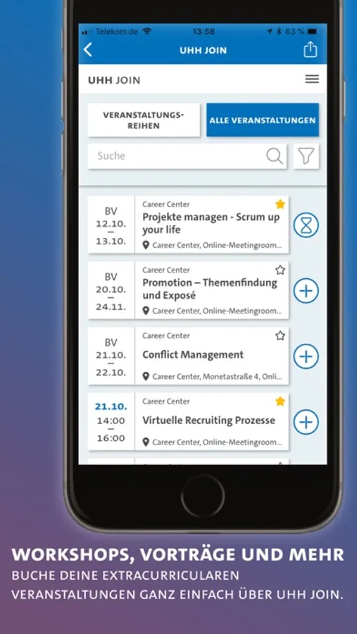 Workshops zum Berufseintieg, Karaoke Nights, Gut organisiert durchs Studium... Buche deine extracurricularen Veranstaltungen ganz einfach über UHH Join – inkl. Merkliste und Timetable.