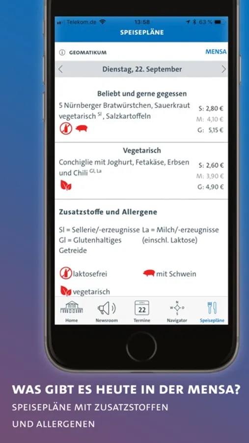 Was gibt’s heute in der Mensa? Die Öffnungszeiten und Speisepläne sämtlicher Mensen und Cafés mit Angabe der Zusatzstoffe und Allergene.