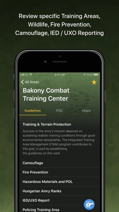 Success of the Army's mission depends on sustaining realistic training conditions through good environmental stewardship. The Integrated Training Area Management (ITAM) program - a core component of the U.S. Army Europe's Sustainable Range Program (USAREUR SRP) - contributes to this goal, in part by establishing the guidelines contained in the Soldier's Field Card app.