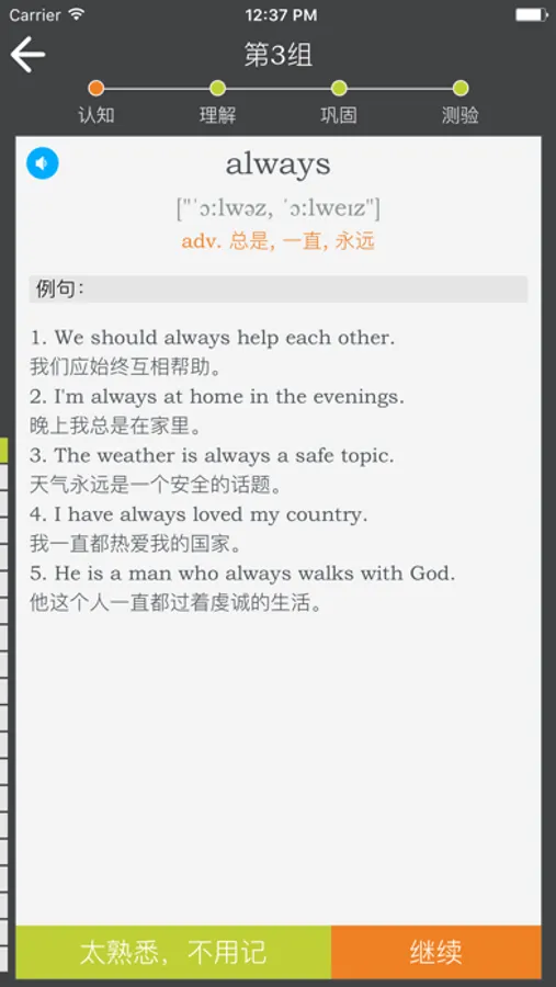 3、碎片化时间背单词,是本软件的显著特色,单词不分组,随时打开随时背,在厕所、在公交车地铁上、睡觉前......任何大于1分钟的时间,都可以用来背单-
