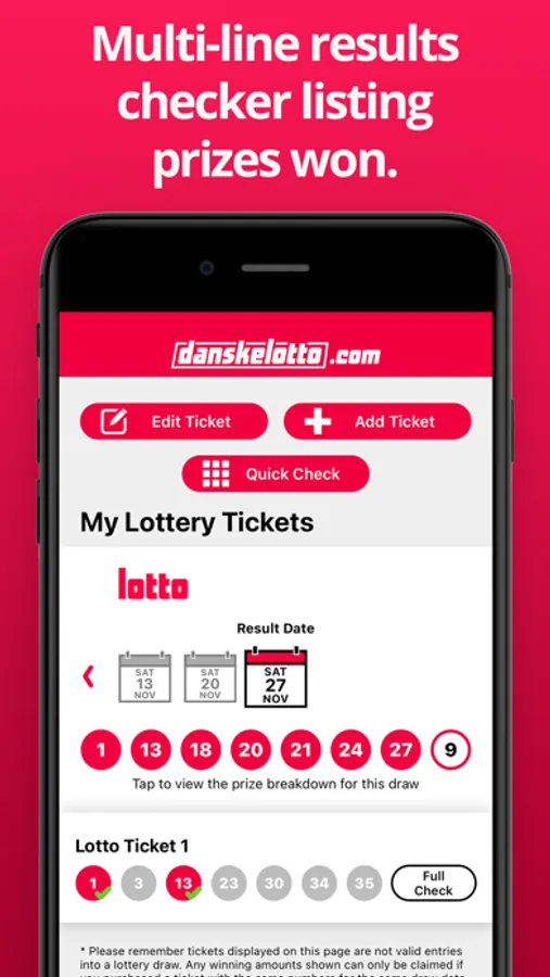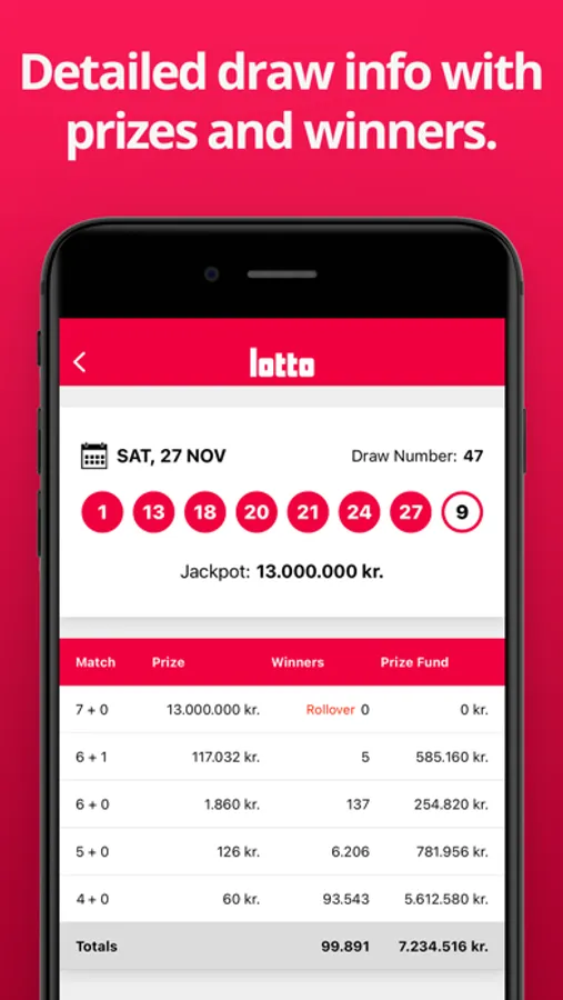 Get the latest Danish Lottery results within seconds of the draws taking place. This easy-to-use app shows the National Lottery numbers, prize breakdown information and jackpots for the following lotteries: