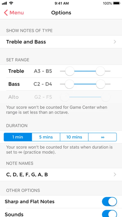 • Custom Practice Range - Set your own range of notes that you want to practice with.