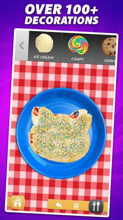 First, add ingredients and mix the crepe batter. Then, cook the crepe and fill the insides with sauces and fillings. Fold the crepe into tons of shapes, and then top the crepe off with whatever decorations you desire! Finally, eat the crepe virtually, or show it to your friends through Facebook or email!