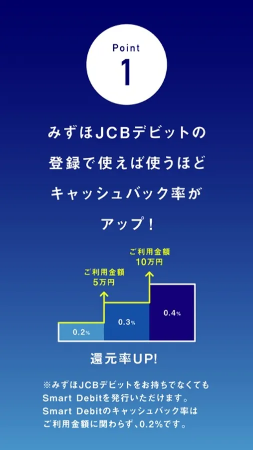 みずほJCBデビットならお支払金額に応じてキャッシュバック率がアップ!みずほWalletアプリにみずほJCBデビットを登録することで、アプリ内でキャッシュバック率を確認できます。