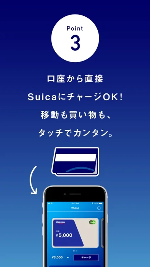 アプリ内に発行されるMizuho Suicaというバーチャルカードに、口座から直接チャージできます。お支払の際は、「スイカで」とお伝えいただき、iPhoneやApple Watchをかざすだけ!