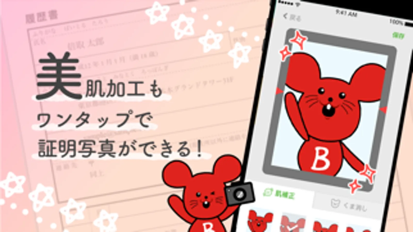 履歴書を作るとき、プロフィールや自己PRに加えてなくてはならないもの。それはあなたの顔写真。履歴書作成アプリなら、スマートフォン搭載のカメラで作成が可能です。履歴書に使いたい素敵な笑顔のベストな顔写真が撮れたら、お好きなサイズに切り抜いて登録するだけ。アプリの「履歴書」の写真スペースに登録されるから、もう証明写真を撮影するために駅やカメラ屋さんへ撮りに行く手間やお金が節約できます!