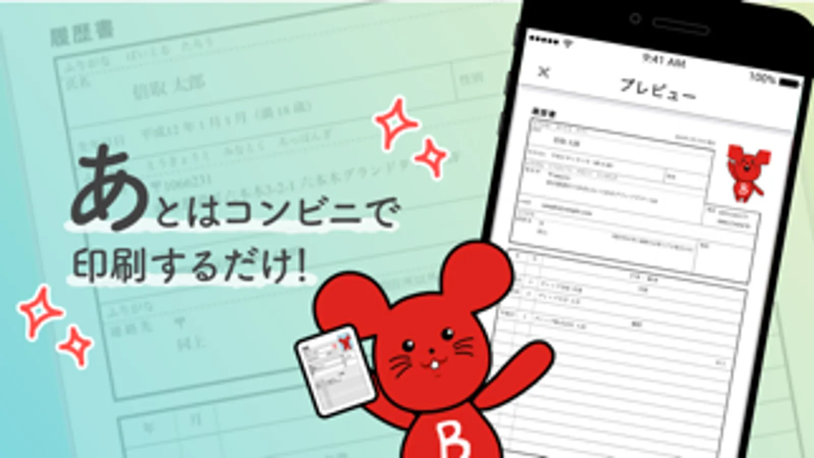 履歴書作成の後、他のアプリと連動してコンビニでプリントしたり、メールに添付して送信したりもできるので、好きな場所で印刷可能。