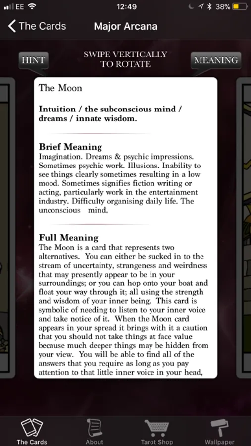 Anyone who has ever tried to read tarot cards, knows how important it is to firstly fully understand and learn the meaning of each individual tarot card. With the swipe of a finger this tarot app gives fast access to tarot meanings compiled from some of the best and well known, traditional tarot meaning sources available. There is a handy hint for each card in both its upright and reversed (upside down) position to aid learning. As well as this, each card has a section on keywords, a brief meaning, a full meaning and general card information. All of this is also included when the card appears upside down or reversed. Some of the more common hidden meanings of the cards are also revealed.