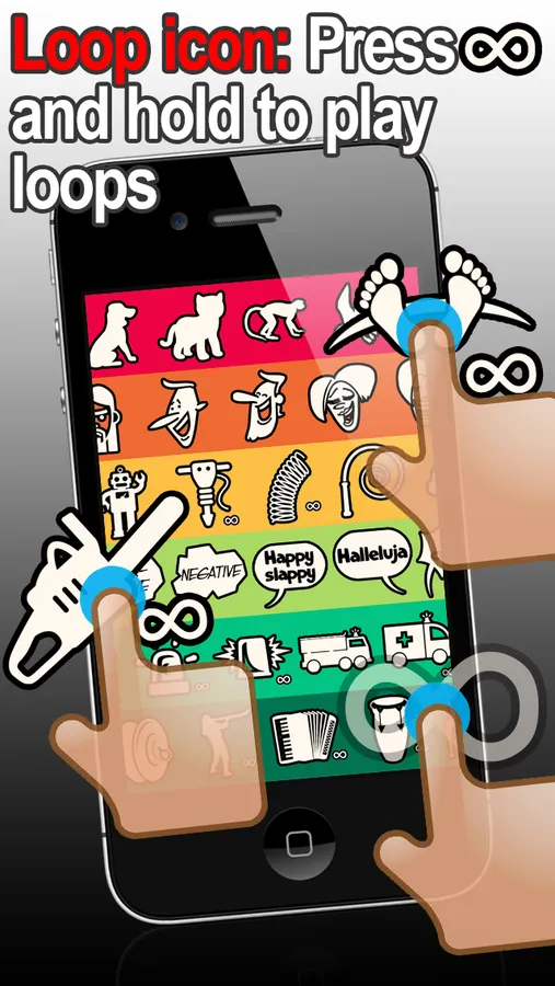 More than 200 cool, freaky and funny sounds. Humans, animals, things, laughter, sayings, alarms, weapns, musik – everything included. Simple top use. Scroll thhrough six soundbars to choose your sound. Play multiple sounds simultaneously. Sounds with the loop-icon can be played endless by tapping and holding.