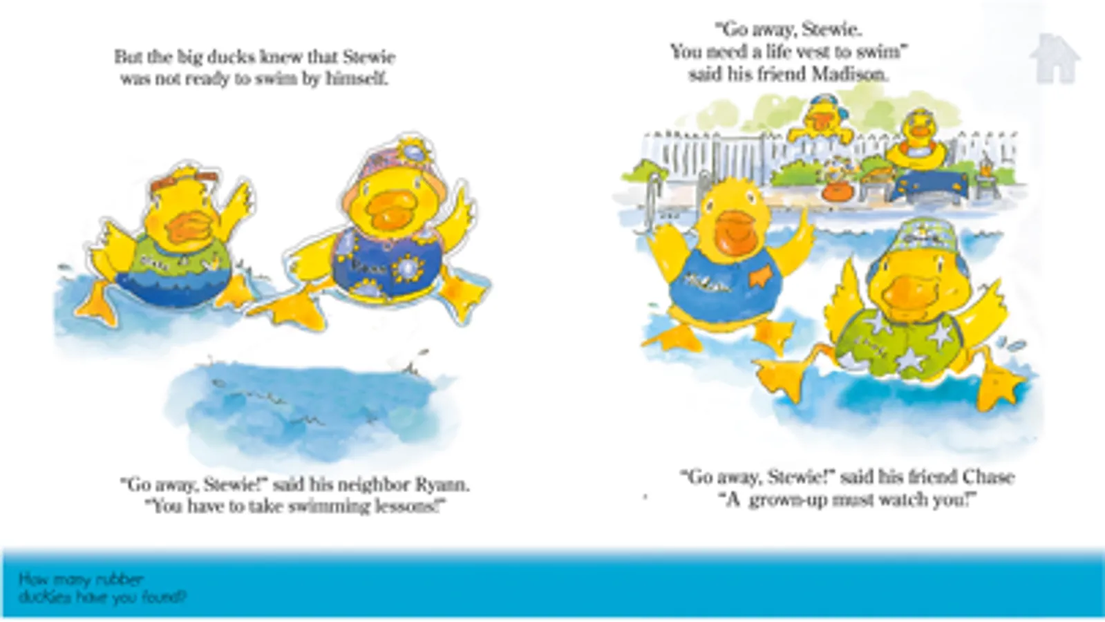 Stewie the Duck Learns to Swim is a child’s first guide to water safety. Written for children ages two through six, the book conveys an important message of how to be safe near the water through the story of Stewie, a duck who wants to swim with the ‘big ducks,’ but is prevented from going in the water by his older sisters until he learns the water safety rules. The book features read-to-me audio and contains interactive animations, sound effects, a memory game, and a sing-along.