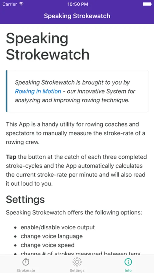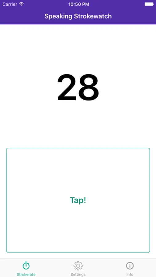 Tap the button at the catch of each three completed stroke-cycles and the App automatically calculates the current stroke-rate per minute and will also read it out loud to you.