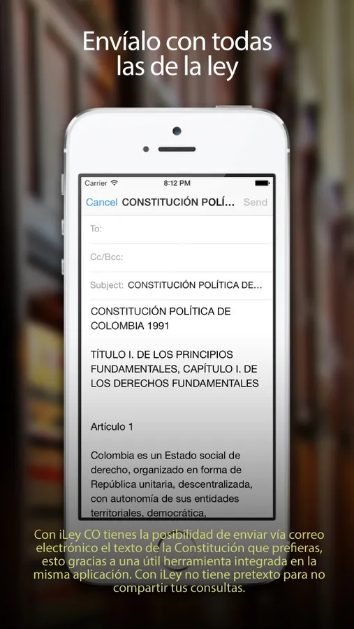Con iLey CO tienes la posibilidad de enviar vía correo electrónico el texto de la Constitución que prefieras, esto gracias a una útil herramienta integrada en la misma aplicación. Con iLey no tiene pretexto para no compartir tus consultas.