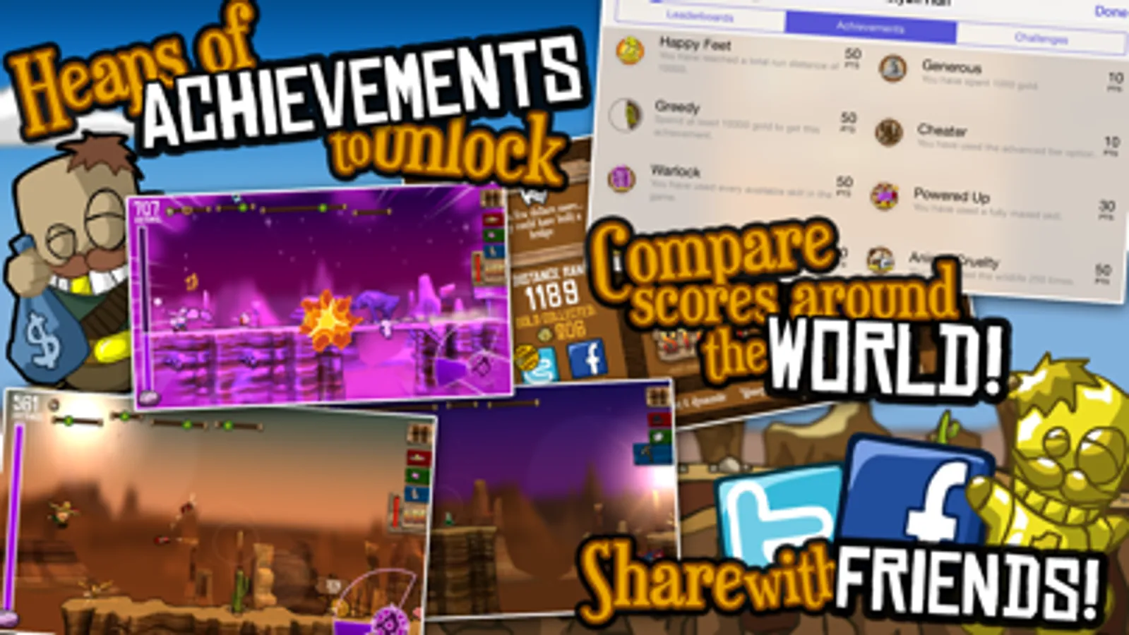 Heaps of achievements and leaderboards so you can prove your mad skills to the world, along with Twitter and Facebook posting.