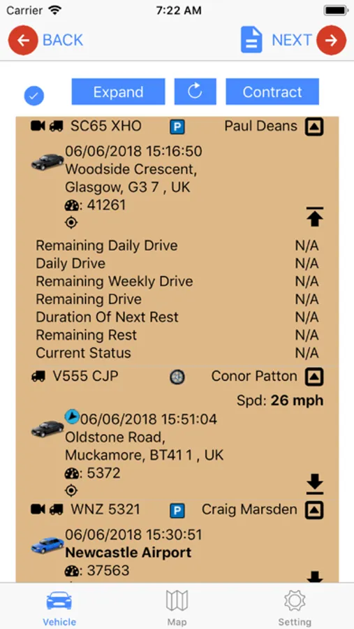 Vehicles - shows latest data bout your vehicle location, speed and heading