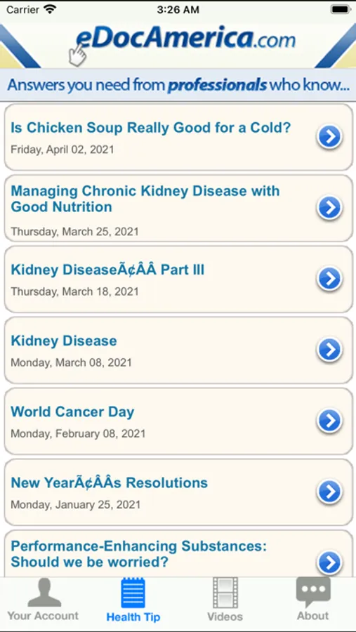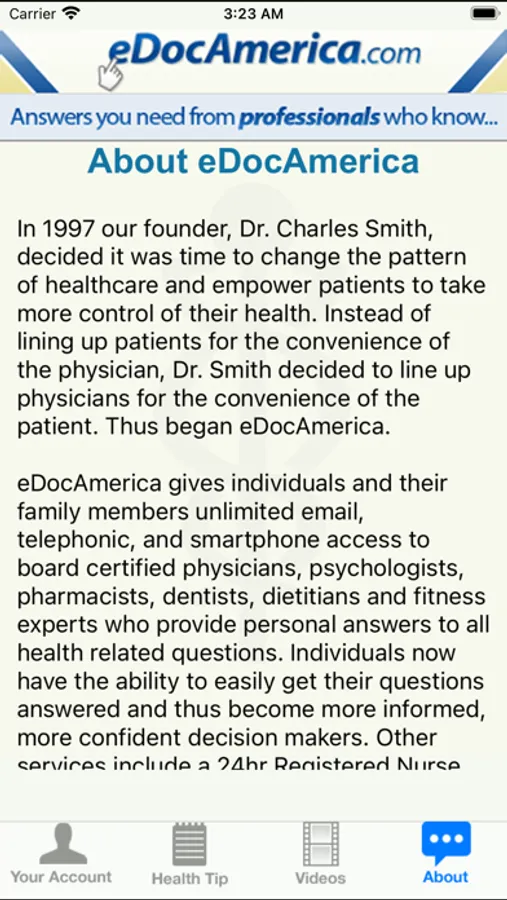 The app also provides users access to various other eDocAmerica tools including the Weekly Health Tip, eDoc Voice, Nurse Line, Customer Service, and more. It is completely free for our users and provides them a new, convenient access point to get the answers they need from professionals who know.