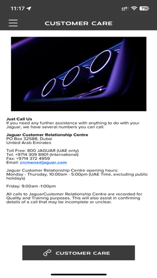 If you need any further assistance with anything to do with your Jaguar Land Rover vehicle, there is a list of contact numbers, email addresses and locations on hand within the Customer Care App.