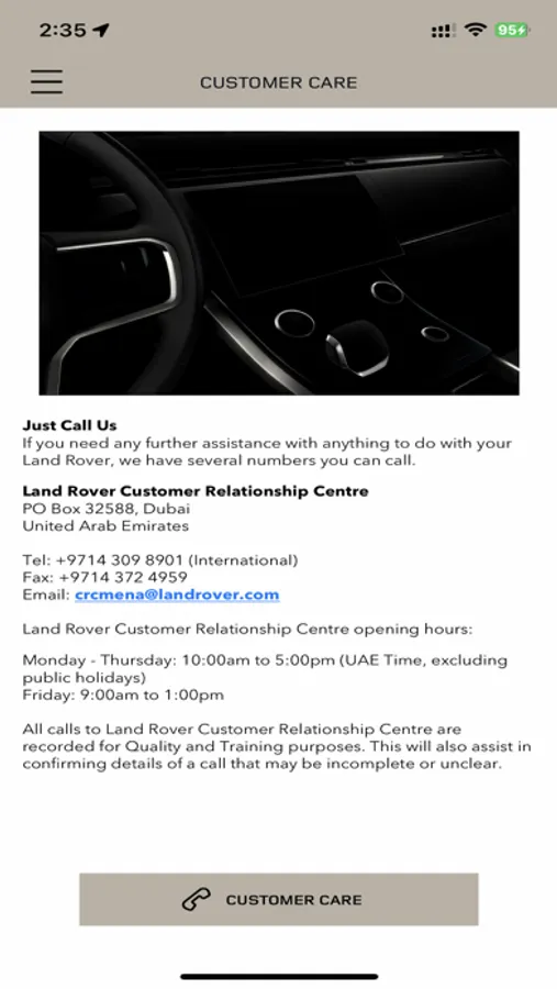 If you need any further assistance with anything to do with your Jaguar Land Rover vehicle, there is a list of contact numbers, email addresses and locations on hand within the Customer Care App.