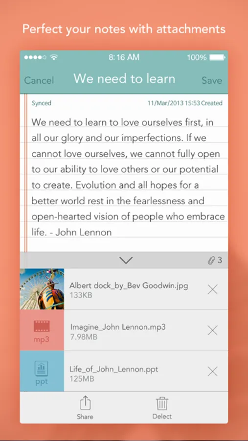 SomNote is the best notepad app that over 2+ million users already picked! Along with a beautifully designed user interfaces, it offers high-speed access. Moreover, you can change fonts for free and it allows you to attach pictures or documents on the notes. Notes and attached files can be automatically synced so you can view it on all your devices, including PCs and iPads. Synced notes and files can be restored safely even after you've reformatted your devices. The future of notepad is in SomNote. Check it out now!