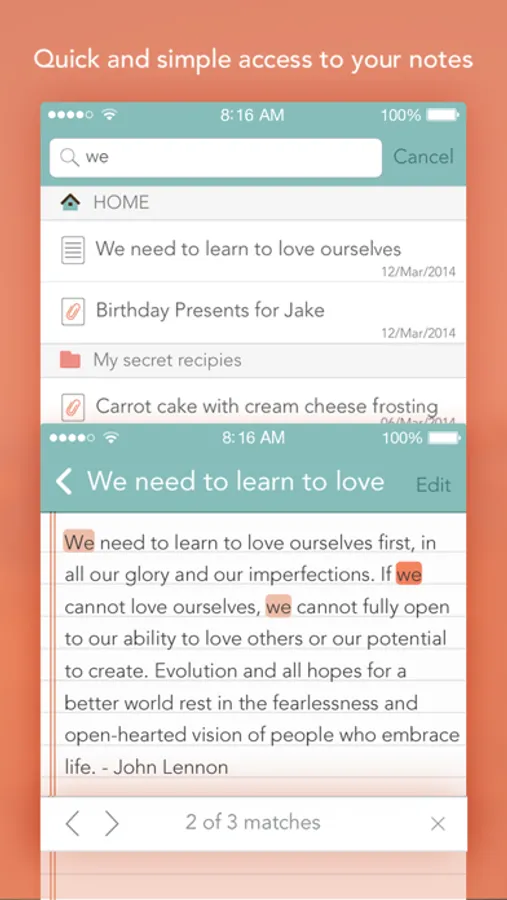 - Finding your note: You can find every note with the Search menu. It will instantly highlight every note and folder simultaneously as you type what you want to find.