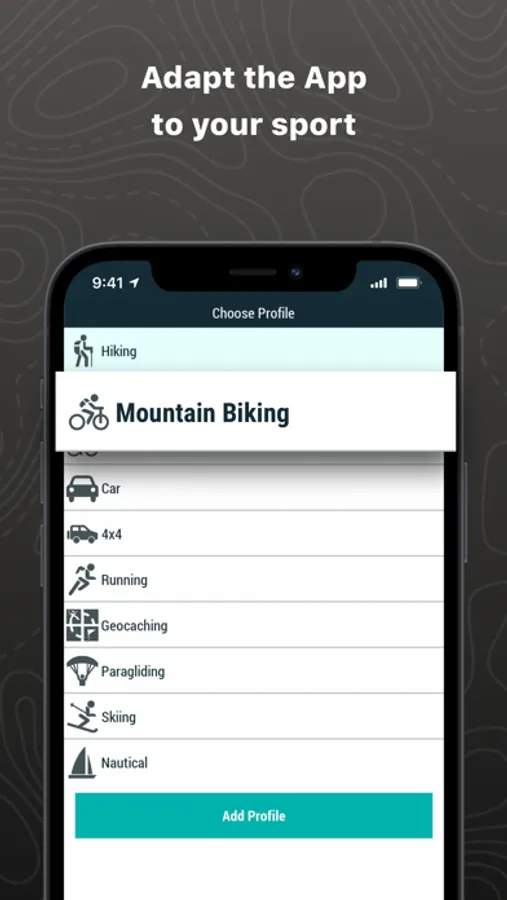 TwoNav can be adapted to different sports, such as hiking, cycling, motor sports, flying, water sports... Create your profile and the app will adapts its configuration to this sport. Do you practice other sports? Create different profiles.