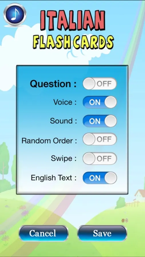 Building strong Italian vocabulary has never been so exciting for preschoolers and toddlers. EFlashApps Italian Educational Baby Flash Cards features over 450 high quality images with text and voiceovers. There are additional real sounds where applicable (such as a lion's roar or an ambulance siren) to enhance visual and auditory learning and memory simultaneously. Parents have the option to turn voiceovers off during parent-child learning session and turn voiceovers on when the child is self-learning. They can enable Question Mode to display 4 images and ask the child to click on the right answer. Complexity of words is perfect for ages 1 to 4 so two or more young siblings can play together and even teach eachother!