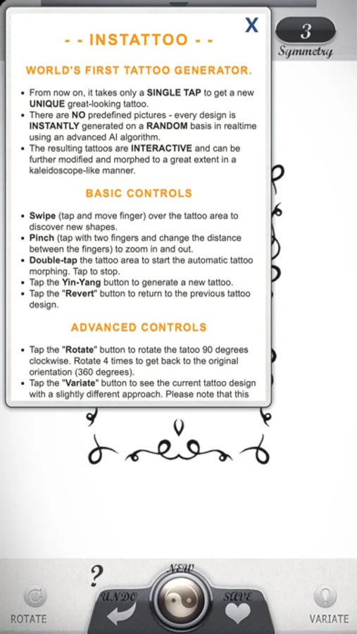 There are more than 128,000 possible designs per style, 5 design sizes and 5 symmetry modes. With all that, Instattoo can be used to produce literally BILLIONS of original tattoos. The simple, clean and unobtrusive user interface makes the tattoo design process extremely fascinating and comfortable, easy yet powerful, unleashing the designer mastermind in every user.