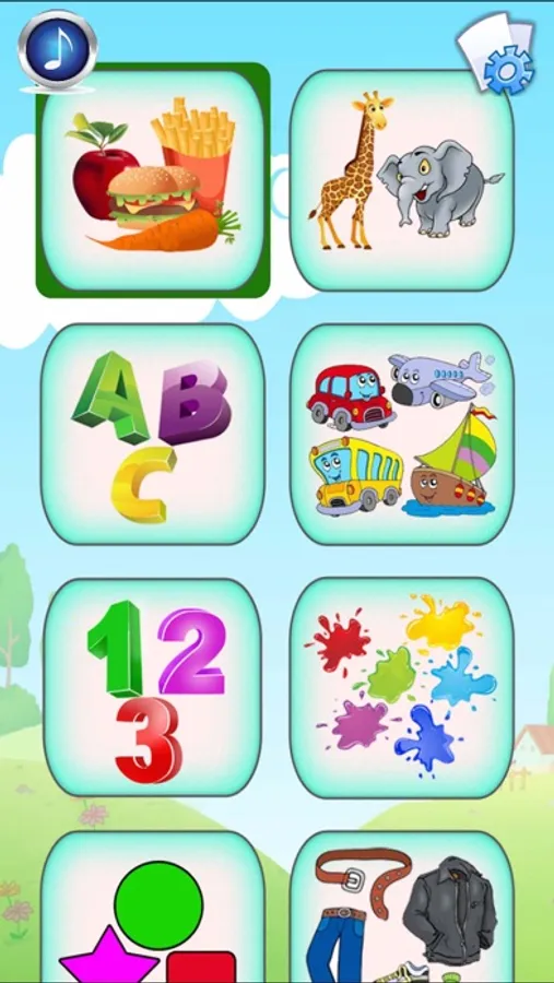 Categories include: Food items, Animals, Alphabet, Transportation, Numbers, Colors & Shapes, Clothing, Household items, Body Parts, Outdoor items, Music Instruments/Arts & Learning.