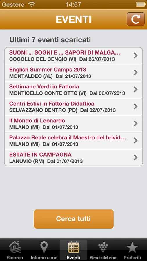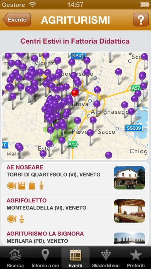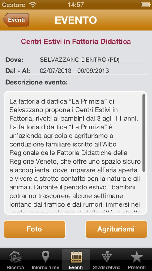 • Lista degli eventi e delle manifestazioni di interesse segnalati dall'associazione Terranostra, con la possibilità di visualizzare gli agriturismi nelle vicinanze.
