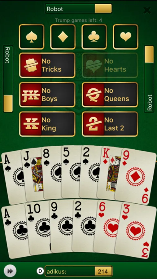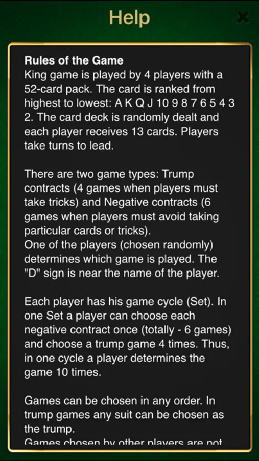 King is a trick-taking card game played by four players. The game is popular in many countries and is similar to the Barbu (Tafferan) game. It uses a standard 52-card pack, ranking from highest to lowest A K Q J 10 9 8 7 6 5 4 3 2 in each of the four suits.