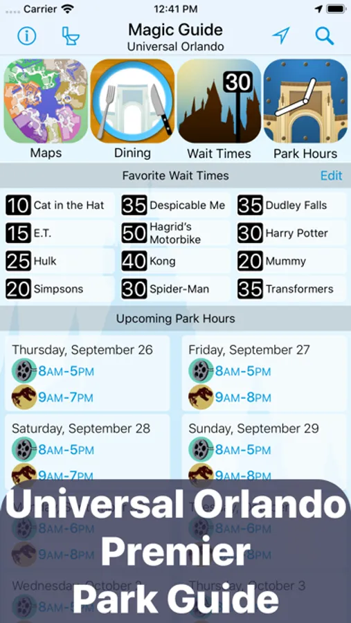 The premier Magic Guide ® to Universal Orlando app includes current wait times, retina park maps, dining menus with search, park hours, favorites, Nearby GPS, photos, and much more.