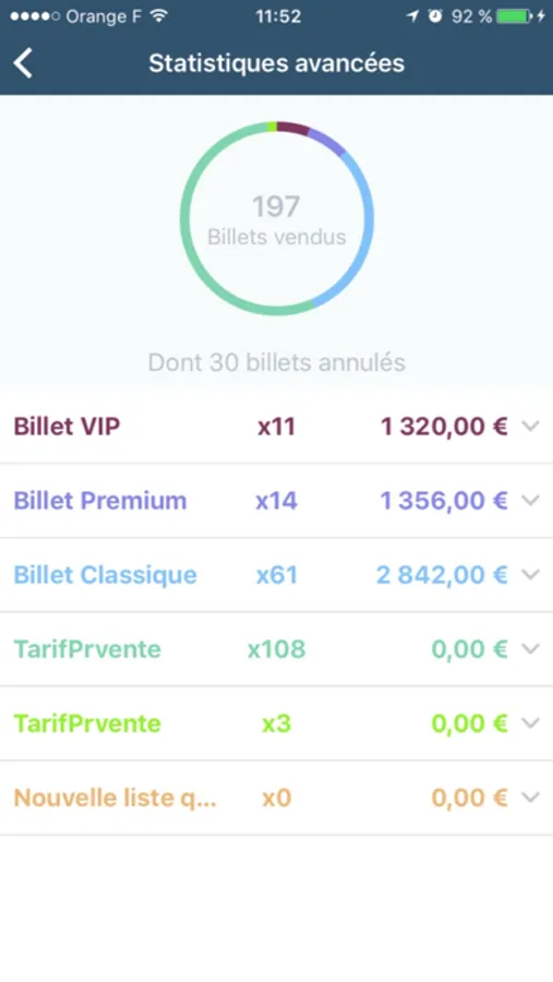 Avec plusieurs niveaux d’administration vous avez accès aux statistiques des ventes et des entrées de votre évènement en direct.