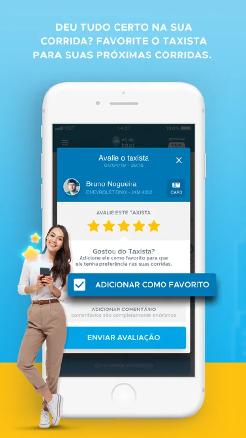 - Taxistas favoritos: Gostou do atendimento? Favorite seu taxista para ser atendido por ele nas próximas corridas;
