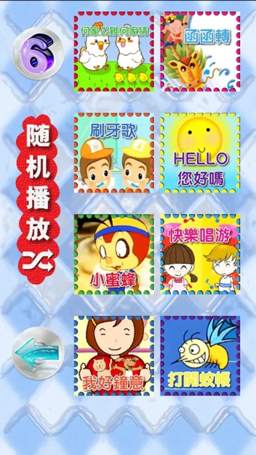 碟6:何家公雞何家猜,函函轉,刷牙歌,HELLO 您好嗎,小蜜蜂,快樂唱游,我好鐘意,打開蚊帳