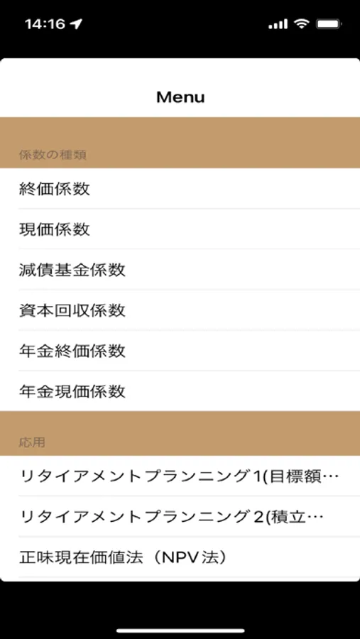 このアプリは、ファイナンシャル・プランニング(資産設計・運用)に便利な終価係数・現価係数・減債基金係数・資本回収係数・年金終価係数・年金現価係数の6係数をiPhone Pickerに登録したものです。元本(元金)や目標額をテンキーで入力した後、ピッカーで利率と年数を合わせると、自動的に係数と計算結果(乗算)を表示します。メール送信機能も付けました。